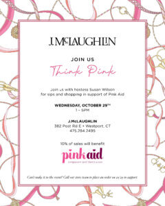 On Wednesday October 29th, J. McLaughlin/Westport will be hosting a shopping day with a percentage of sales going to Pink Aid. Explore new arrivals of timeless clothing for women and men for the season ahead.